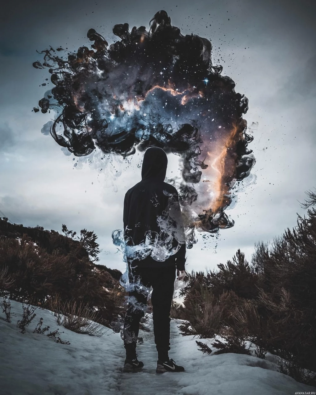 night sky. This creates a contrast between the natural and chaotic elements in the scene. The overall tone of the image is quite dark and intense, possibly symbolizing turmoil or