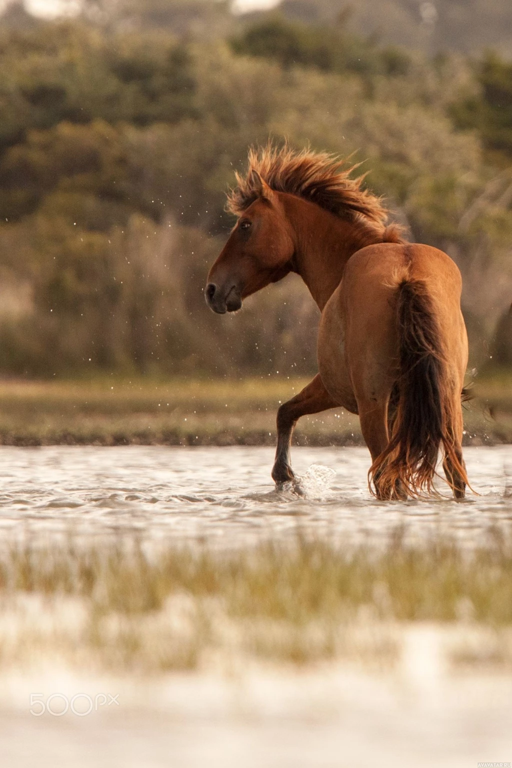 На картинке изображена лошадь, идущая по воде. Кажется, что она находится в движении, возможно, скачет галопом или рысью вдоль берега водоема, такого как река или озеро. Окружающая среда представляет собой естественную среду с растительностью и без каких-либо видимых человеческих структур.