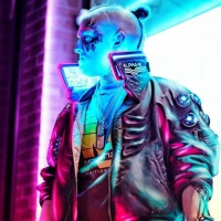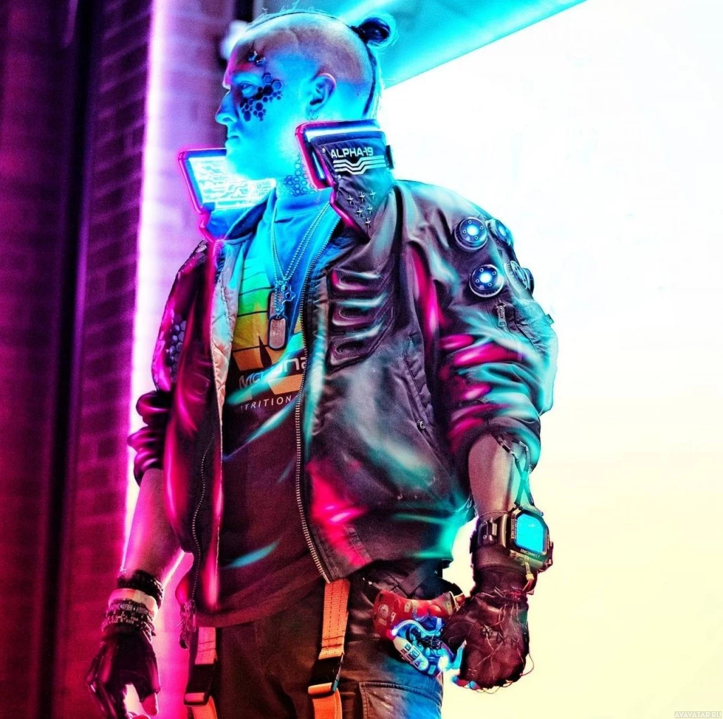 the video game "Cyberpunk 2077." The person is wearing futuristic, tech-oriented clothing and accessories that give them an edgy,