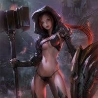 На картинке изображена рыжеволосая женщина в капюшоне. Она держит молот и, похоже, стоит в боевой стойке, что, возможно, указывает на то, что она находится в эпицентре битвы или готовится к ней. Ее наряд, по-видимому, наводит на мысль о роли авантюристки или воина. На заднем плане царит суровая, мрачная атмосфера, которая может подразумевать фэнтезийный или экшн-сеттинг.