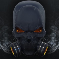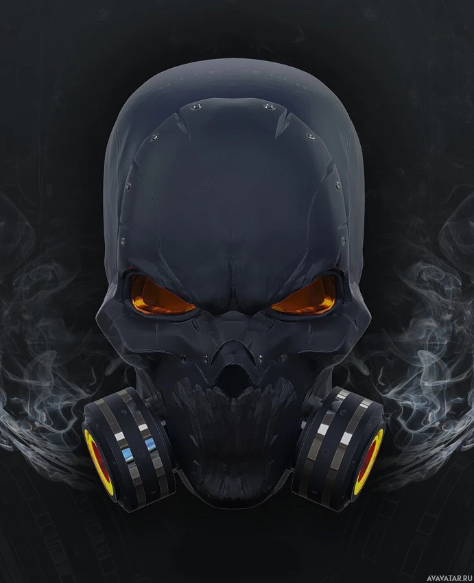 The image features a stylized representation of a skull wearing what appears to be a respirator, also known as