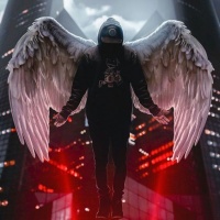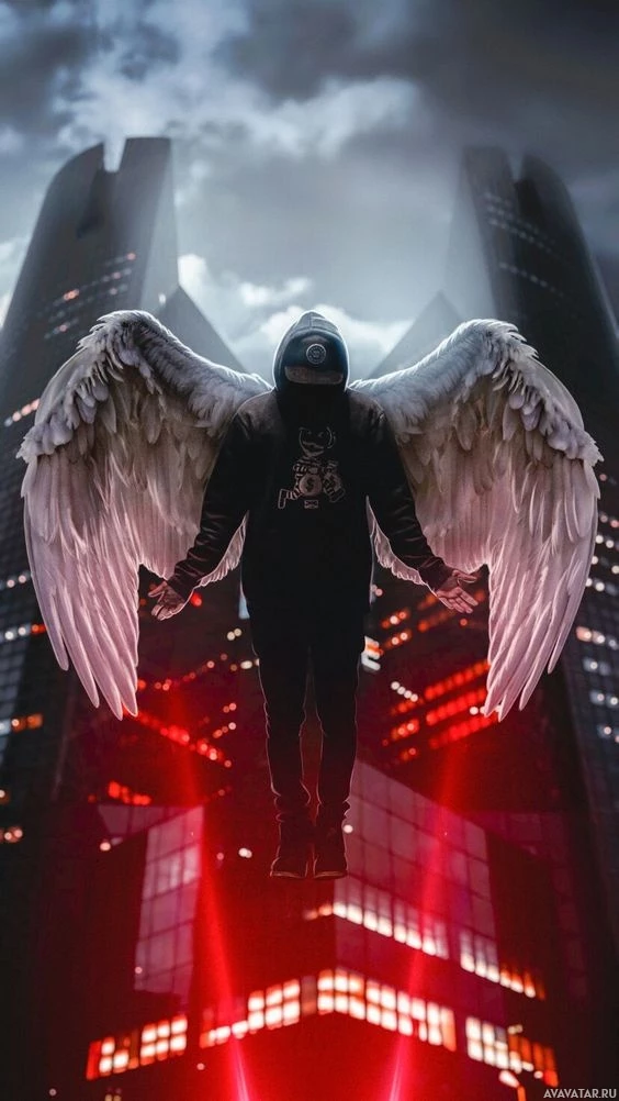 an urban landscape at night, with illuminated buildings and skyscrapers in the background. The overall atmosphere is dramatic and dark, possibly suggesting a theme related to fallen angels or supernatural elements in