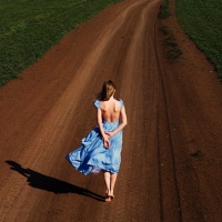 a dirt road. The individual appears to be wearing a light-colored dress that could suggest the attire of a character from
