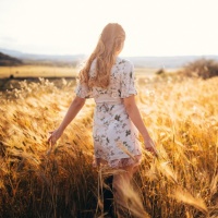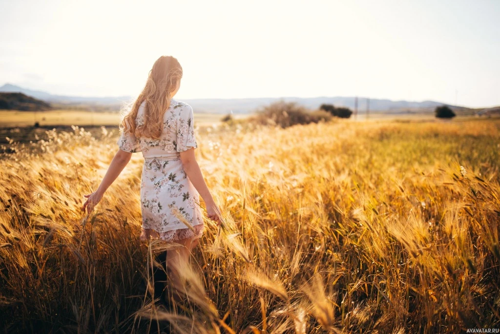 the warm glow of light. The individual is from behind and facing away from the camera, looking out towards the horizon. There are tall grasses swaying in the wind, which suggests a peaceful,