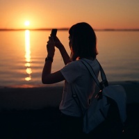 The image shows a person taking a photograph during sunset. The individual is holding up their phone to capture the moment, and it appears that they are facing away from the viewer, creating a back view of them. They have a backpack, which suggests they might be traveling or carrying