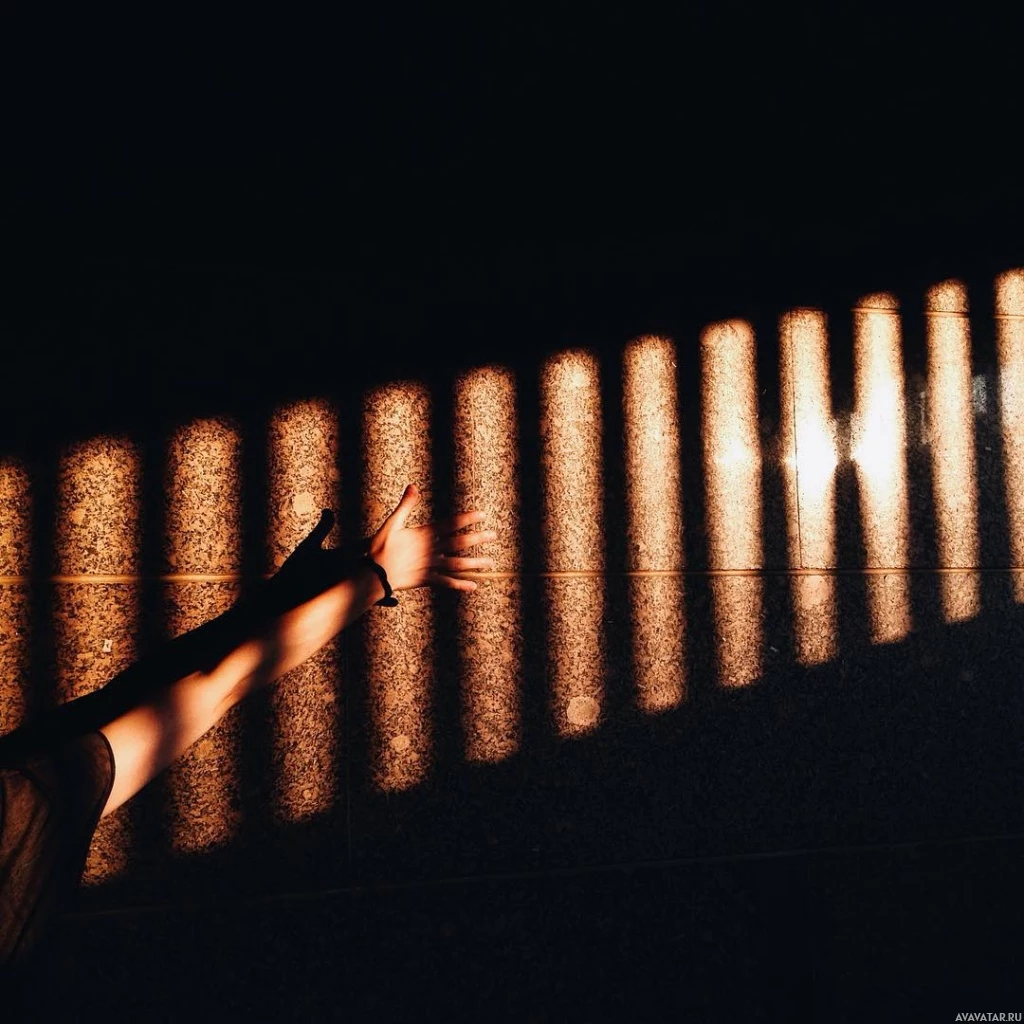 The picture shows a person's hand reaching out towards a wall, possibly attempting to touch or interact with it. There is sunlight shining through an indented