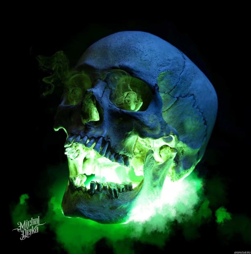 На картинке изображен человеческий череп, изо рта которого исходит зеленый свет, придающий ему угрожающий или жутковатый вид. Из области носа черепа также выходит небольшое количество дыма, что усиливает жуткий эффект. Такого рода изображения часто ассоциируются с тематикой Хэллоуина или декорациями и мероприятиями на тему ужасов.
