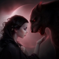 a fantasy scene featuring a woman with long hair, wearing what appears to be a dark robe or cloak. She is positioned next to a werewolf with sharp teeth and