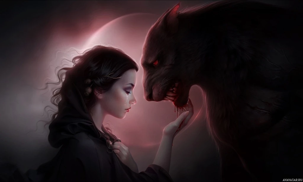 toned background, which gives the scene an eerie or supernatural atmosphere. The girl's expression is calm and focused, while the werewolf seems to be looking at her with