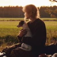 The image shows a woman sitting on the ground, holding a small dog in her arms. She appears to be enjoying a sunset or sunrise in a natural setting with trees and grass around. There is a camping area visible with tents set up. The woman seems relaxed and content as she spends time with her pet during this peaceful moment.