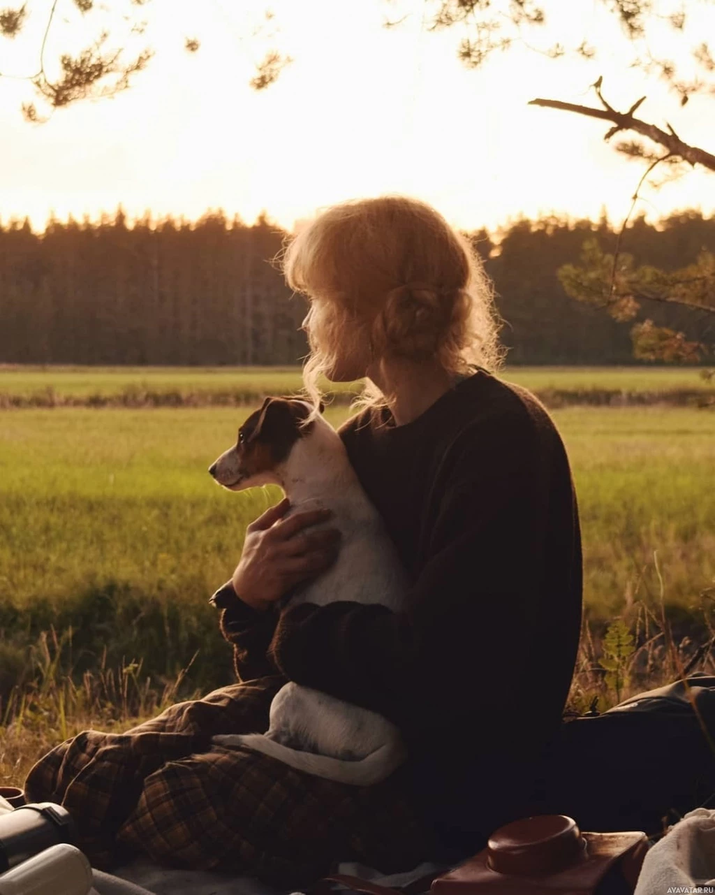 На картинке изображена женщина, сидящая на земле и держащая на руках маленькую собачку. Кажется, что она наслаждается закатом или восходом солнца на лоне природы, окруженная деревьями и травой. Видна территория кемпинга с установленными палатками. Женщина выглядит расслабленной и довольной, проводя время со своим питомцем в этот мирный момент.