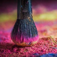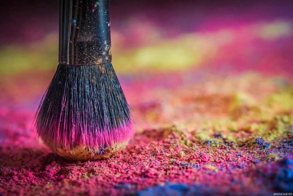 colorful surface that appears to be covered in powdered pigments. These colors are not typically seen together, which gives the image an abstract or artistic feel. The brush itself seems well-used and is likely used for applying the pigments. The background is out of focus,