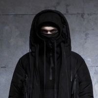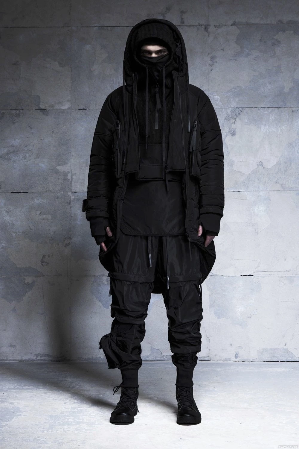 a high collar, resembling a hacker or gamer style. They are also wearing boots and have their hands tucked into