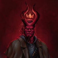 book superhero created by writer and artist Mike Mignola. In the illustration, the character is depicted with horns on his head, a red skin tone, and a somewhat