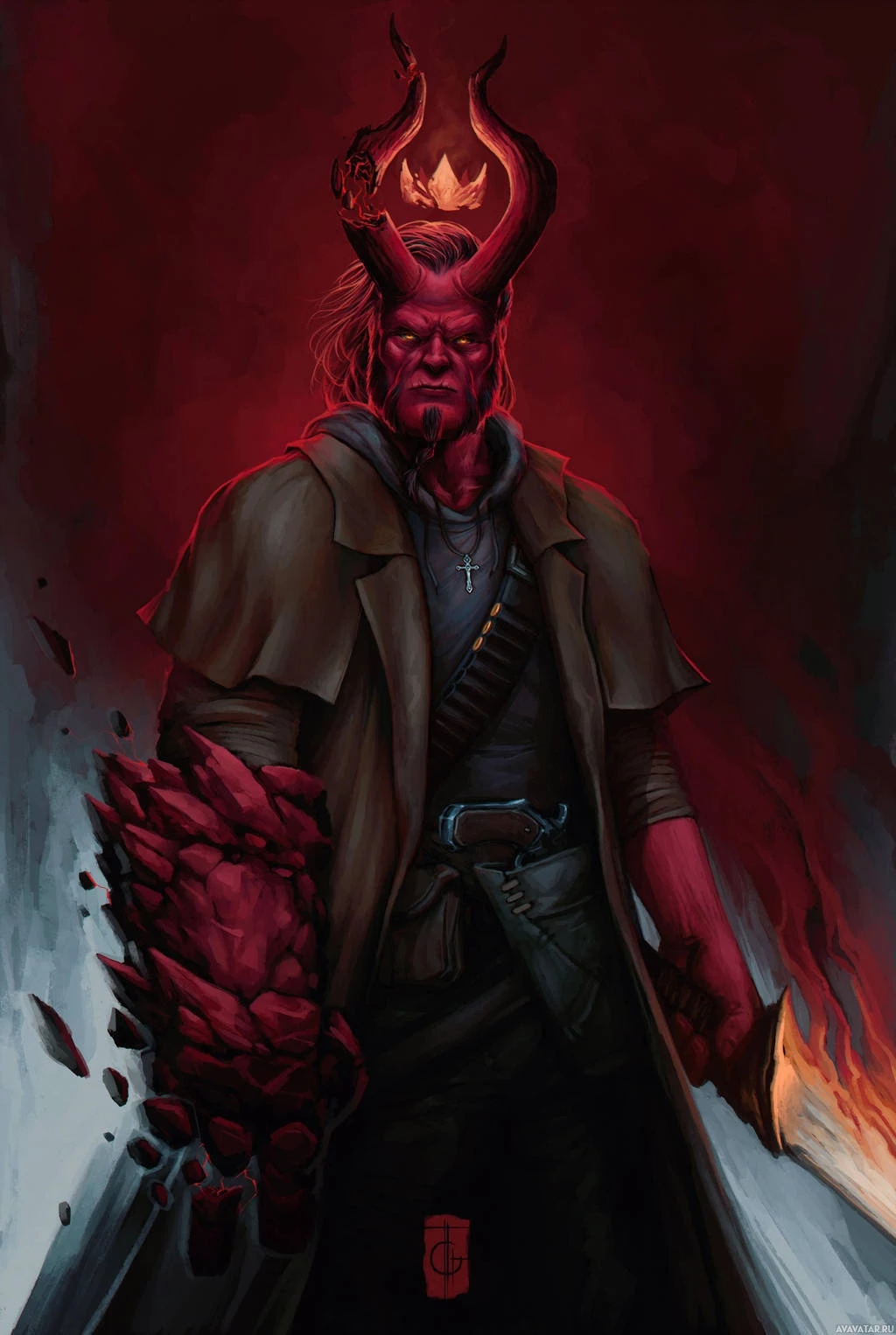 The image shows an illustration of a character that resembles Hellboy, a popular fictional comic