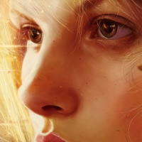 blonde hair, which is partly obscured by her gaze. The background includes