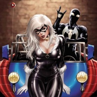 web shooters, standing behind Black Cat as if he's watching over or interacting with her. The vehicle they are depicted in is reminiscent of the Batmobile from the "Batman" comics and movies. The artwork has a dynamic and vibrant feel, capturing the essence of these characters.