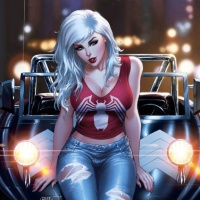 Gwen Stacy, a well-known comic book superheroine associated with Spider-Man. She is depicted sitting in the driver's seat of a black vintage jeep. This artwork is likely inspired by the Marvel