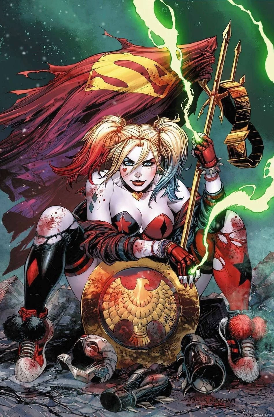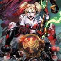 Harley Quinn, a fictional villainess from the DC Comics universe. In this particular illustration, Harley Quinn is depicted with her distinctive red and black costume, holding a mallet in one hand and