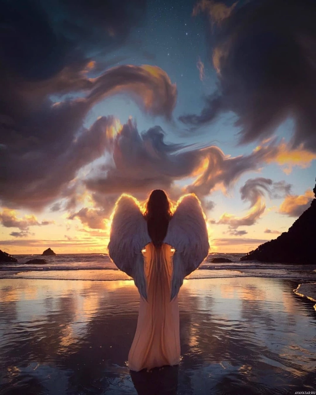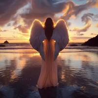 flowing hair that resembles feathers and a robe that adds to her ethereal appearance. The setting appears to be at sunset or dusk, with a backdrop of clouds, sea, and land, creating
