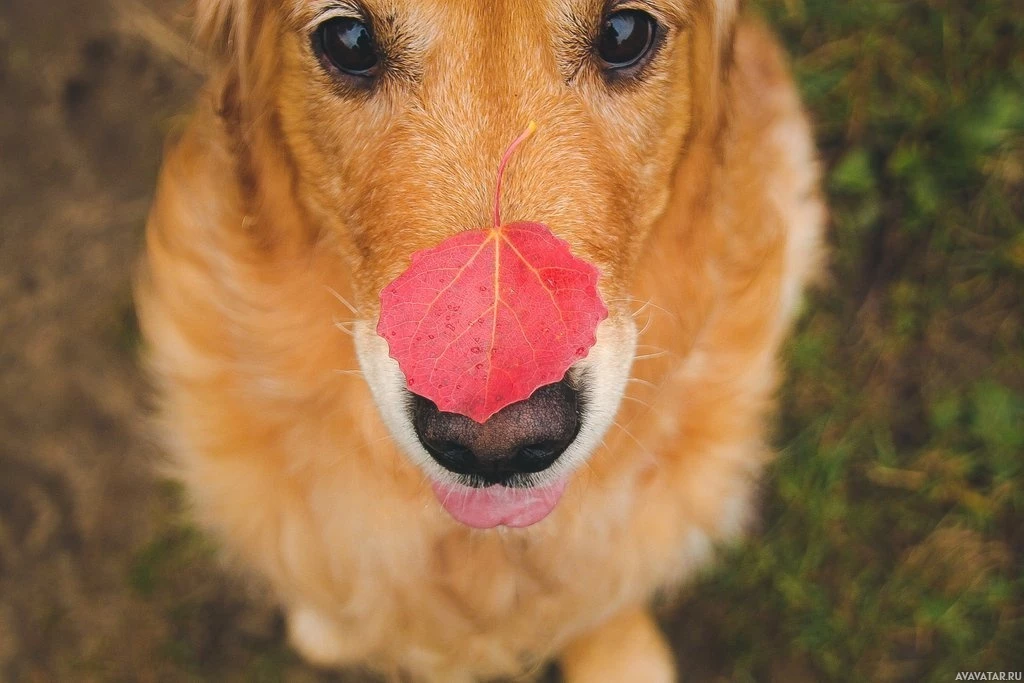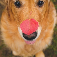 maple leaf placed on its nose. The dog has a happy and curious expression, looking directly at the camera with its tongue slightly out, as if it's trying to lick the leaf off or simply enjoying the sensation of it.