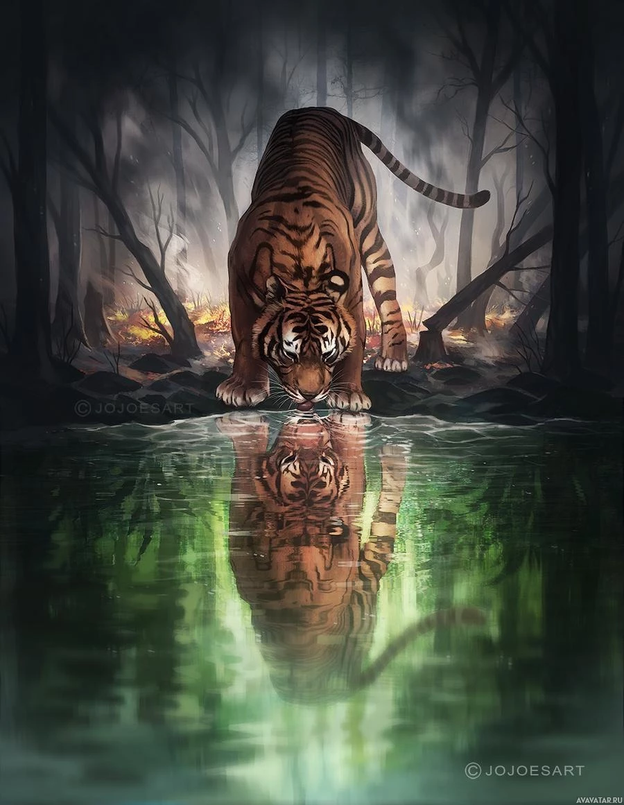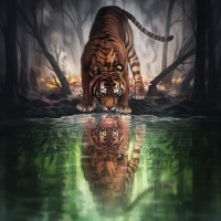 This is a digital artwork depicting a tiger in an enigmatic and somewhat eerie setting. The tiger is standing by the water's edge, with its reflection clearly visible on