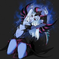 Vengeful Spirit, a demonic-looking entity with wings and horns. In the artwork, she appears to be kneeling on one knee with her left arm raised and her right hand extended, possibly in a gesture of greeting or commanding attention. The background has a dark, starry sky effect, which might suggest