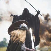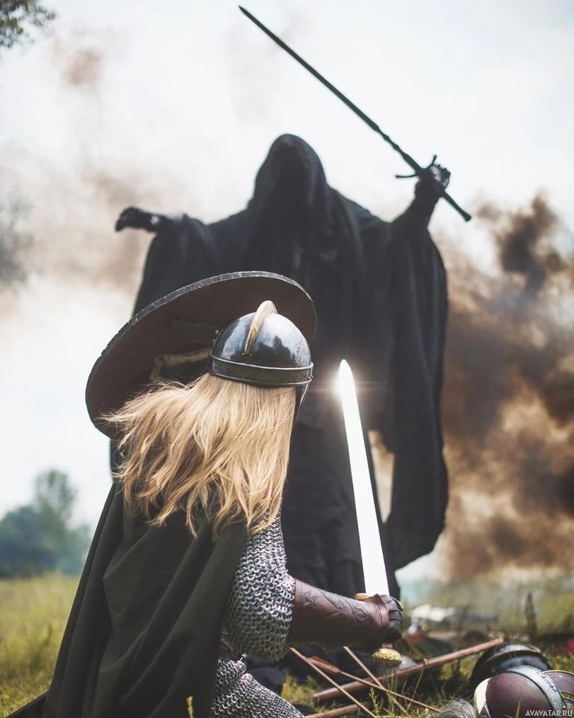 На картинке изображен женский персонаж, одетый во что-то похожее на средневековые или фантастические доспехи, с мечом в руках, стоящий рядом с фигурой, похожей на назгула из Средиземья. Действие происходит на открытом воздухе, среди деревьев и дыма вокруг них.