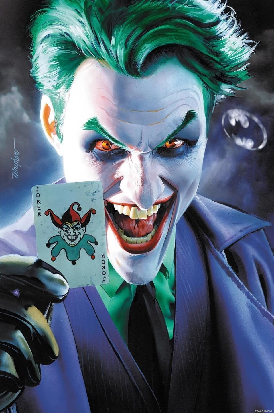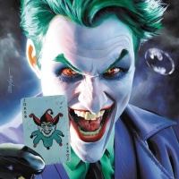 green hair and makeup, a purple suit with white teeth grimacing on it, and black gloves. The Joker is holding a playing card up to his face, which seems to be an Ace of Spades with a drawing of a jester's face on it, further emphasizing his chaotic and unpredictable nature as the character from