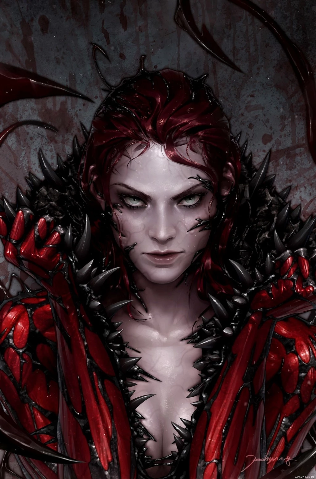 metallic armor and what seems to be a red, tendril-like outfit or skin, which are elements associated with the Carnage character. The artwork has a dark and ominous atmosphere, fitting for