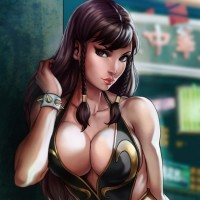 a female character with a confident pose against a backdrop that appears to be an urban street scene, possibly inspired by a city like Hong Kong. She is wearing a black and gold costume which could suggest she is a character from the "