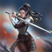 a female character, likely an elf in fantasy-style attire. She is holding a sword and appears to be engaged in combat or readiness for battle. Her pose suggests that she is skilled with the weapon. The setting seems dynamic, possibly during a battle or a moment of