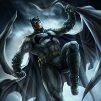 muscular form suggests he's ready for action, which aligns with the vigilante persona of Batman. The background has dark, moody tones that enhance