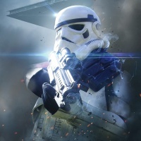 the Galactic Empire's military in the Star Wars universe. The background suggests an action-packed scene with what appears to be spaceships and possibly explosions or energy blasts, indicating that this could be