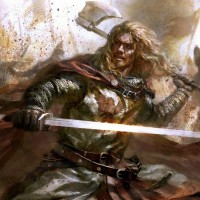 The image depicts a warrior, possibly from a historical or mythological context. The character is holding a sword in one hand and an axe in the other. He's wearing armor that suggests he might be a figure from Norse, Roman, or Celtic history. The background appears chaotic with battle elements like smoke and debris, which further emphasizes the theme of warfare.