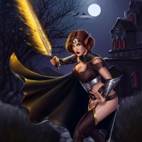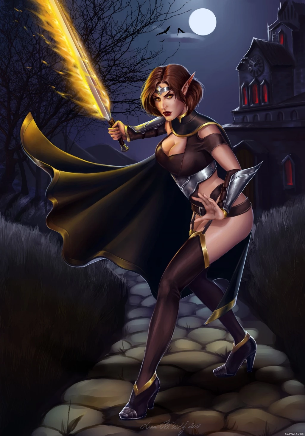a fantasy world with a moody atmosphere due to the night sky and the silhouette of trees and buildings in the background. The character's attire, including her cloak and leggings, are detailed and give her a formidable appearance.