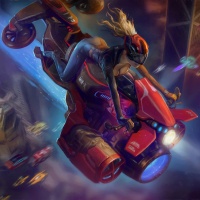 blonde hair and is shown riding a futuristic motorcycle or vehicle that resembles a robotic creature, with mechanical parts visible on its structure. The background suggests a bustling urban environment, possibly set in the future, given