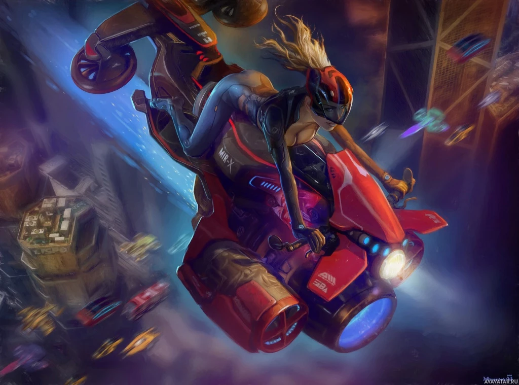 the advanced technology and design of the vehicles surrounding her. The style of the artwork is illustrative and seems to be designed for a fantasy or science fiction context.