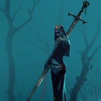 a female figure, possibly a warrior or guardian type, given the sword she's holding. She is dressed in armor with intricate designs and stands on what looks like a swampy ground or water body, indicative of a dark or mystical setting, which could be a part of
