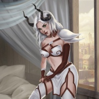 female character with white hair. She is dressed in a fantasy-style outfit that includes elements of armor and lingerie, suggesting a scene from
