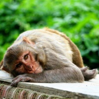The image shows a monkey lying on its back with its legs stretched out. It appears to be resting or possibly sunbathing, as it's laying on what looks like