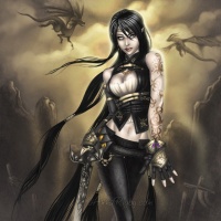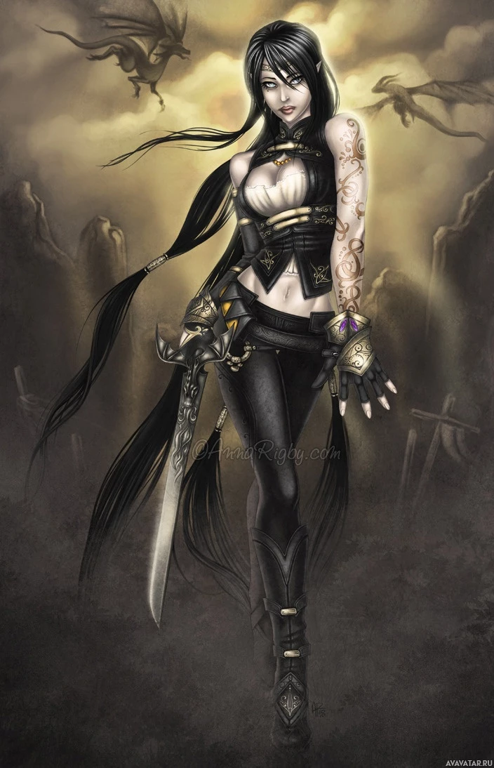 an elven sword, and she has pointed ears, suggesting she might be depicted as an elf in the context of this illustration. The style of her clothing and gear suggests she might be on a quest or journey through