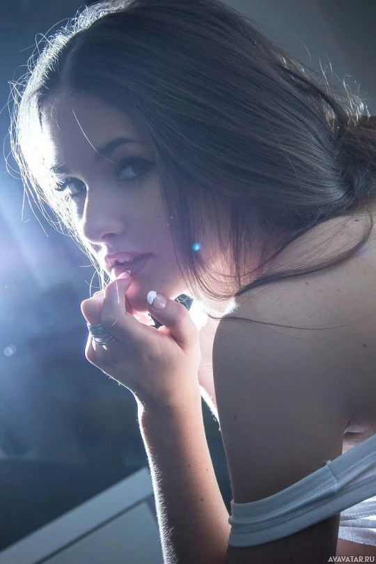 The picture features a woman leaning close to the camera. She appears to be biting her lower lip thoughtfully or perhaps about to speak, with the focus on her lips and