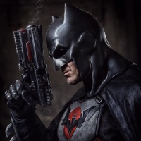 The image features a character known as Batman, holding a gun. Batman is typically associated with
