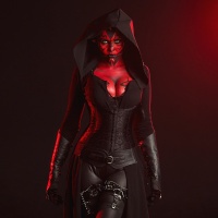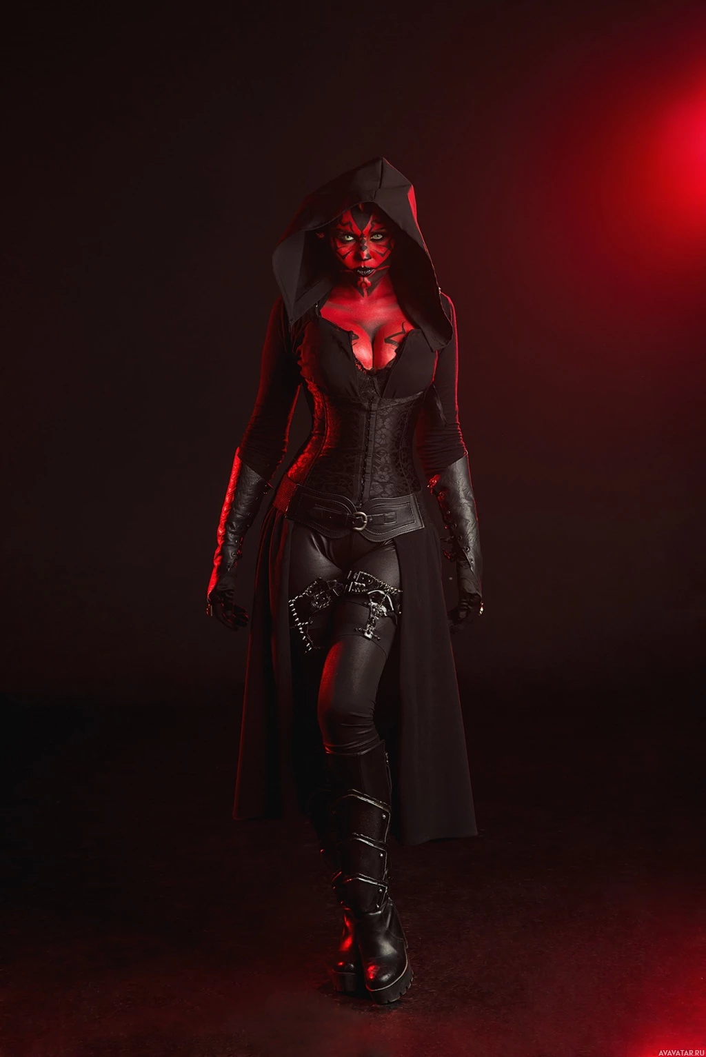 dark clothing and having red markings on their face. The figure in the photo is portraying the character with