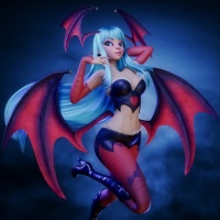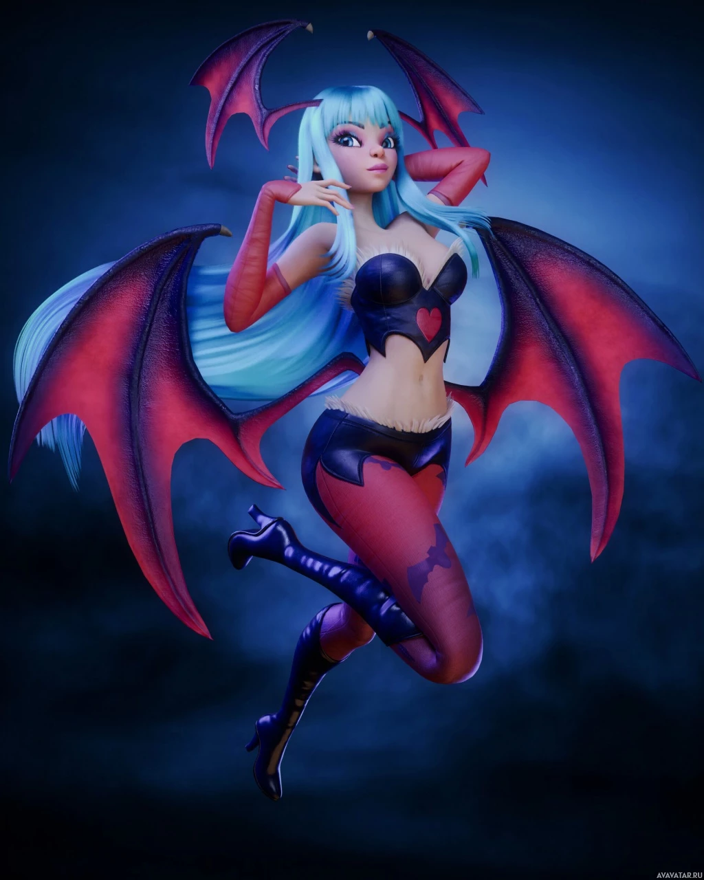 The image features a character that appears to be inspired by fantasy and succubus themes. She has bat-like wings, pointed ears, and is wearing red and black attire reminiscent of the traditional depictions of succubi in