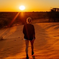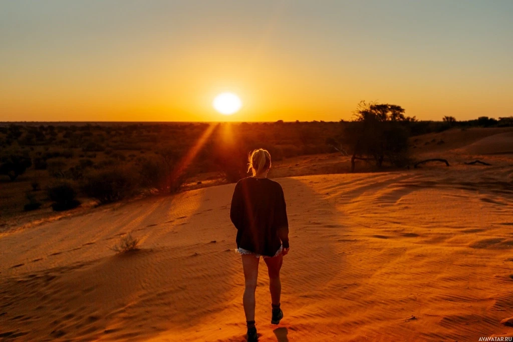 The image depicts a person walking on sandy terrain during what appears to be either sunrise or sunset, as the sky is illuminated by a warm,