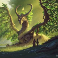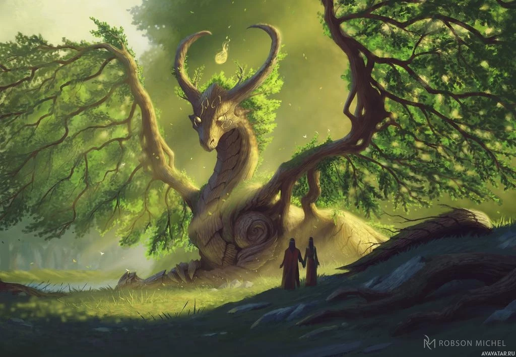 a fantasy scene with a dragon and a tree. The dragon has a humanoid appearance, with horns on its head, standing amidst
