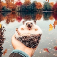 The image shows a hedgehog being held in someone's hand. The person is wearing a coat, and the background features autumn foliage with