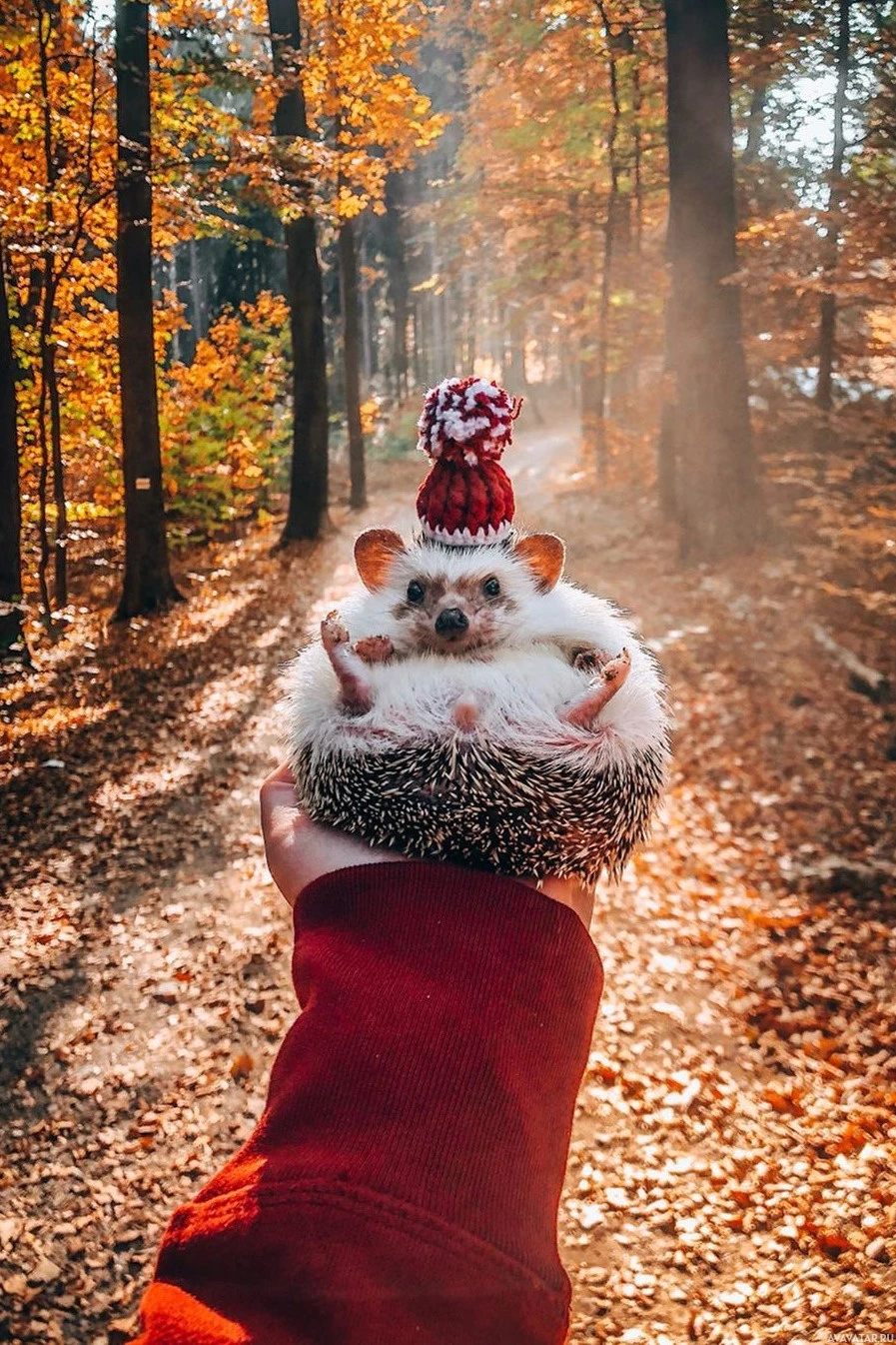 an adorable hedgehog with its paws up in the air, giving it a playful and human-like posture. The hedgehog is wearing a festive red cap, suggesting a seasonal or holiday theme, possibly indicating autumn given the surrounding foliage that looks like it could be from